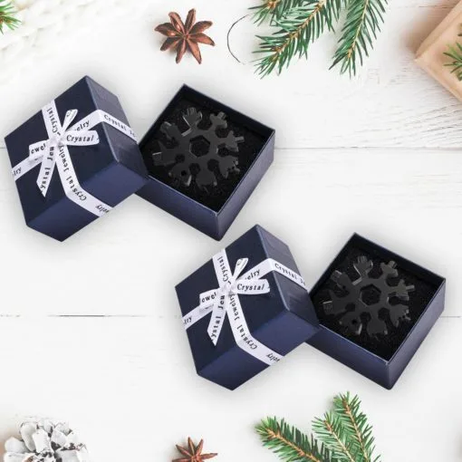 The solid and compact 0.3″ thick snowflake design includes non-removable parts that function as a flat-head screwdriver, box cutter, rope cutter, bottle opener, and a Phillips screwdriver